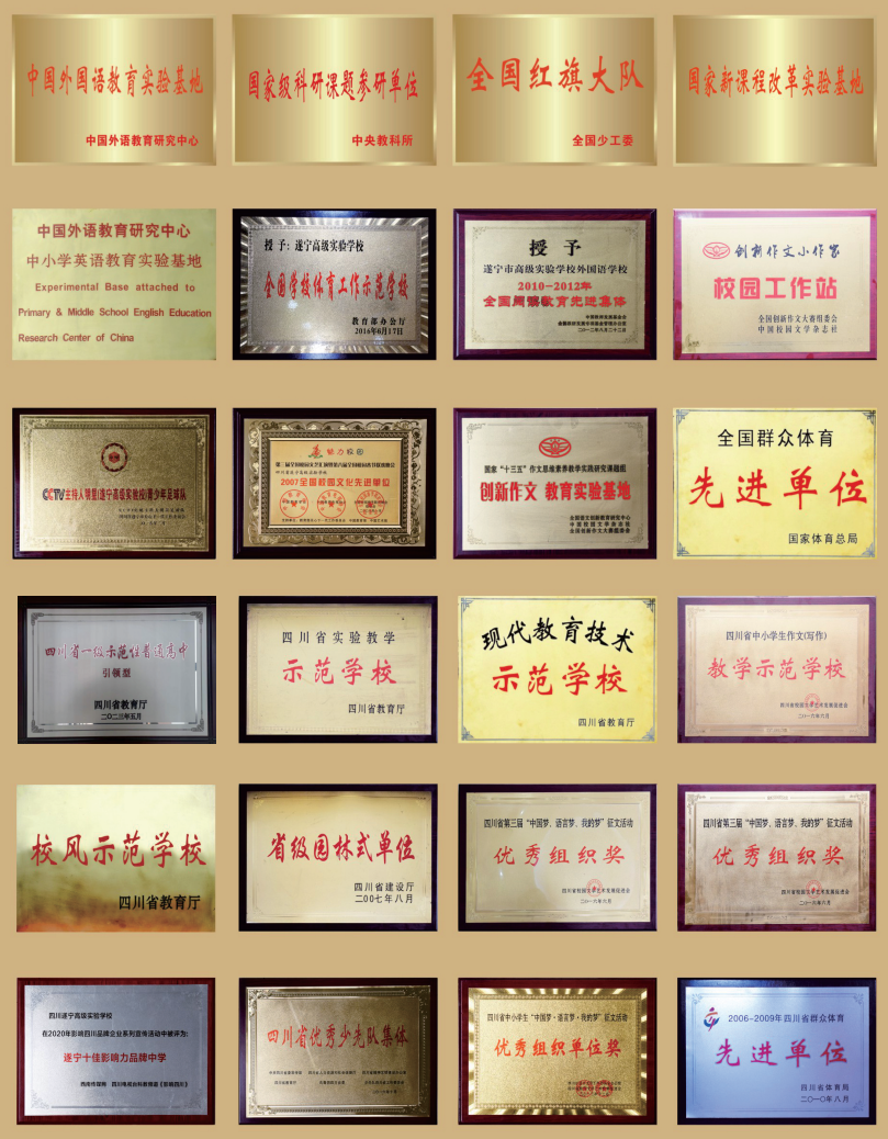 学校先后荣获“全国校园文化先进单位”“全国学校体育工作示范学?!薄叭判慵页ぱJ笛榛亍薄叭嗌倌晷T白闱蛱厣!薄八拇ㄊ⌒7缡痉缎!薄八拇ㄊ∠执逃际跏痉缎!薄八拇ㄊ⊙艄馓逵痉堆!钡仁傧钊儆坪?。