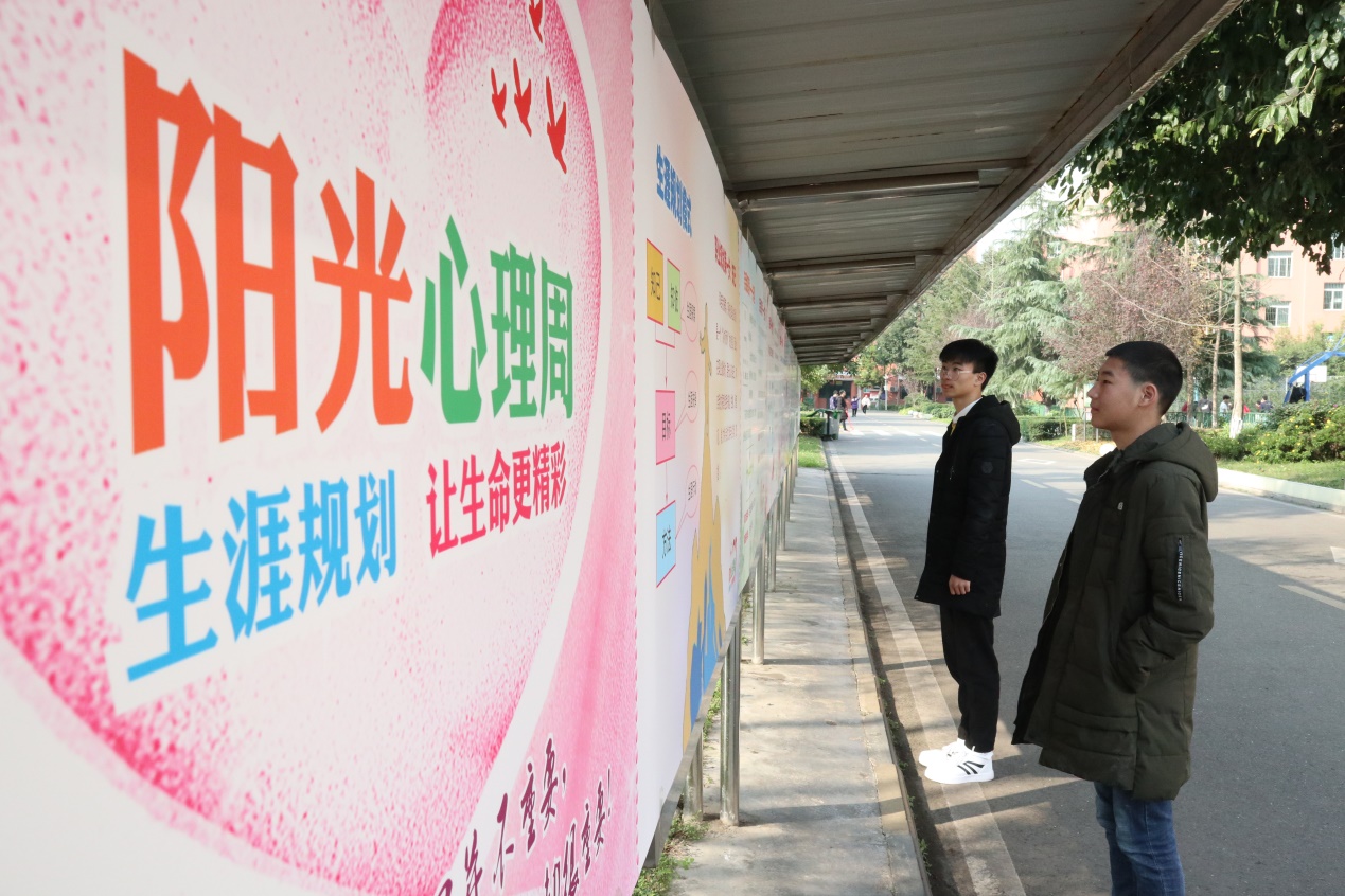 阳光心理周——巨幅知识展板。本次心理周活动制作了长达近50米的知识展板,详细展示了关于生涯规划的各个知识点,精美的版面设计,丰富的知识内容吸引着众多师生驻足观看。