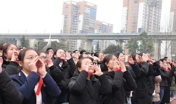 最后,现场各班代表上台高挥彩旗,高呼令人振奋的口号,将整个演讲推向了高潮。“关键时刻,让我们撸起袖子加油干,冲刺名校,圆梦六月!”“I can make it ”“加油!加油!加油……”久久回荡在校园上空。
