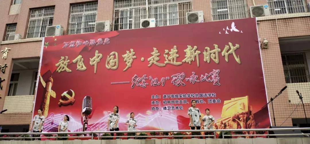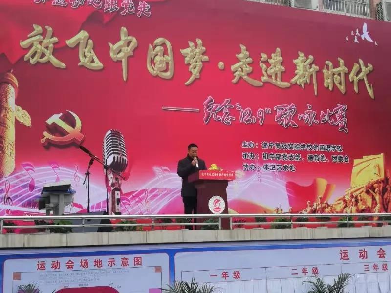 为加强爱国主义教育,弘扬12.9爱国运动精神,丰富学生文化生活,12月5日下午,由遂宁高级实验学校外国语学校初中部党支部、德育处、团委会主办,体卫艺术处协办的纪念“12.9”83周年歌咏比赛在学校操场隆重举行。此次比赛以“不忘初心 跟党走,放飞中国梦,走进新时代”为主题,来自初一、初二年级32个班集体同台竞技,讴歌中国梦,唱响新时代。
