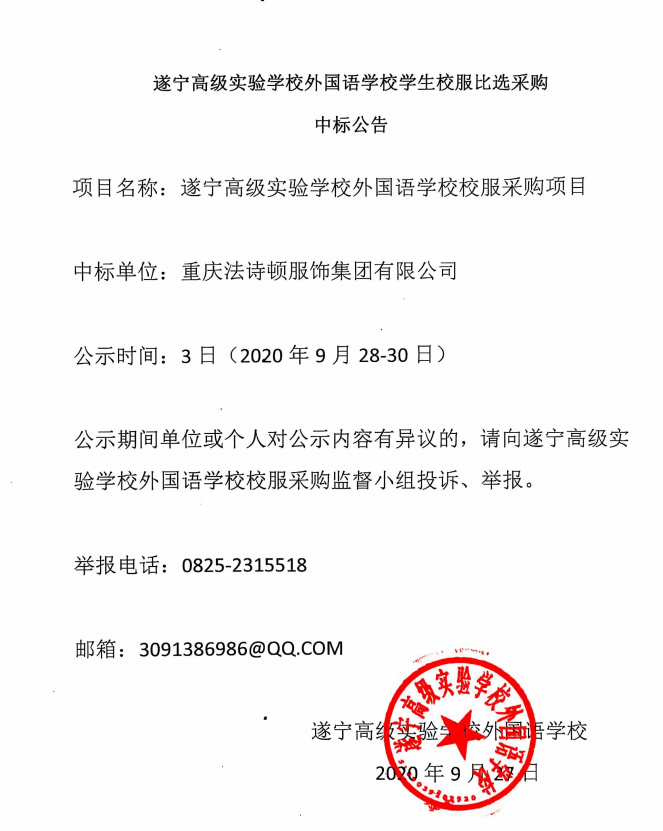 遂宁高级实验学校外国语学校学生校服比选采购中标公告