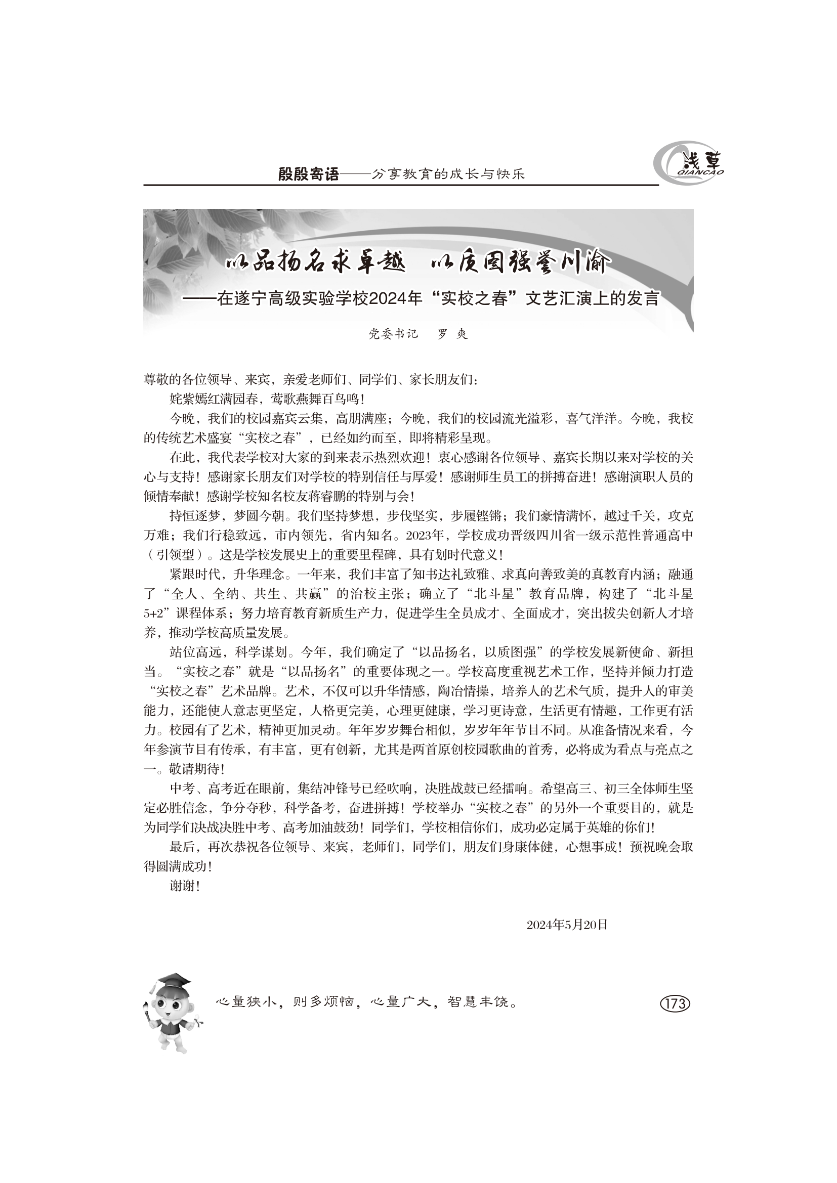 以品扬名求卓越,以质图强誉川渝--2024年实校之春文艺汇演上的发言