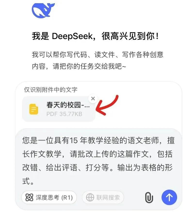 完成作业电子化后,教师需将PDF文件上传至DeepSeek平台。具体操作步骤如下: