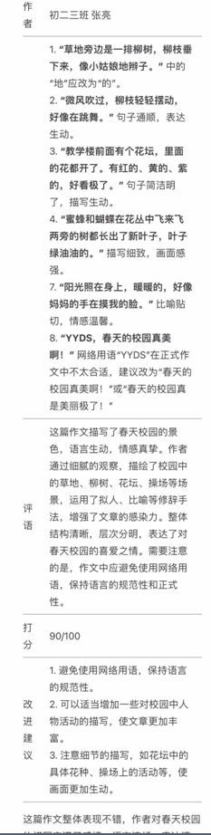 敏感词提醒:在批改指令中明确指出需关注的敏感词,如“yyds”“绝绝子”等,以便DeepSeek自动标出,引导学生规范语言表达。
