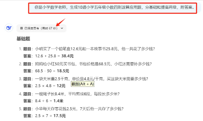 示例:“你是小学数学老师,生成10道小学五年级小数四则运算应用题,分基础和提高两级,附答案”。