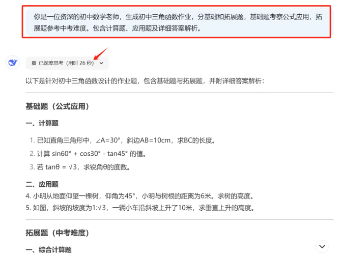 提问词:“生成初中三角函数作业,分基础和拓展题,基础题考察公式应用,拓展题参考中考难度”。