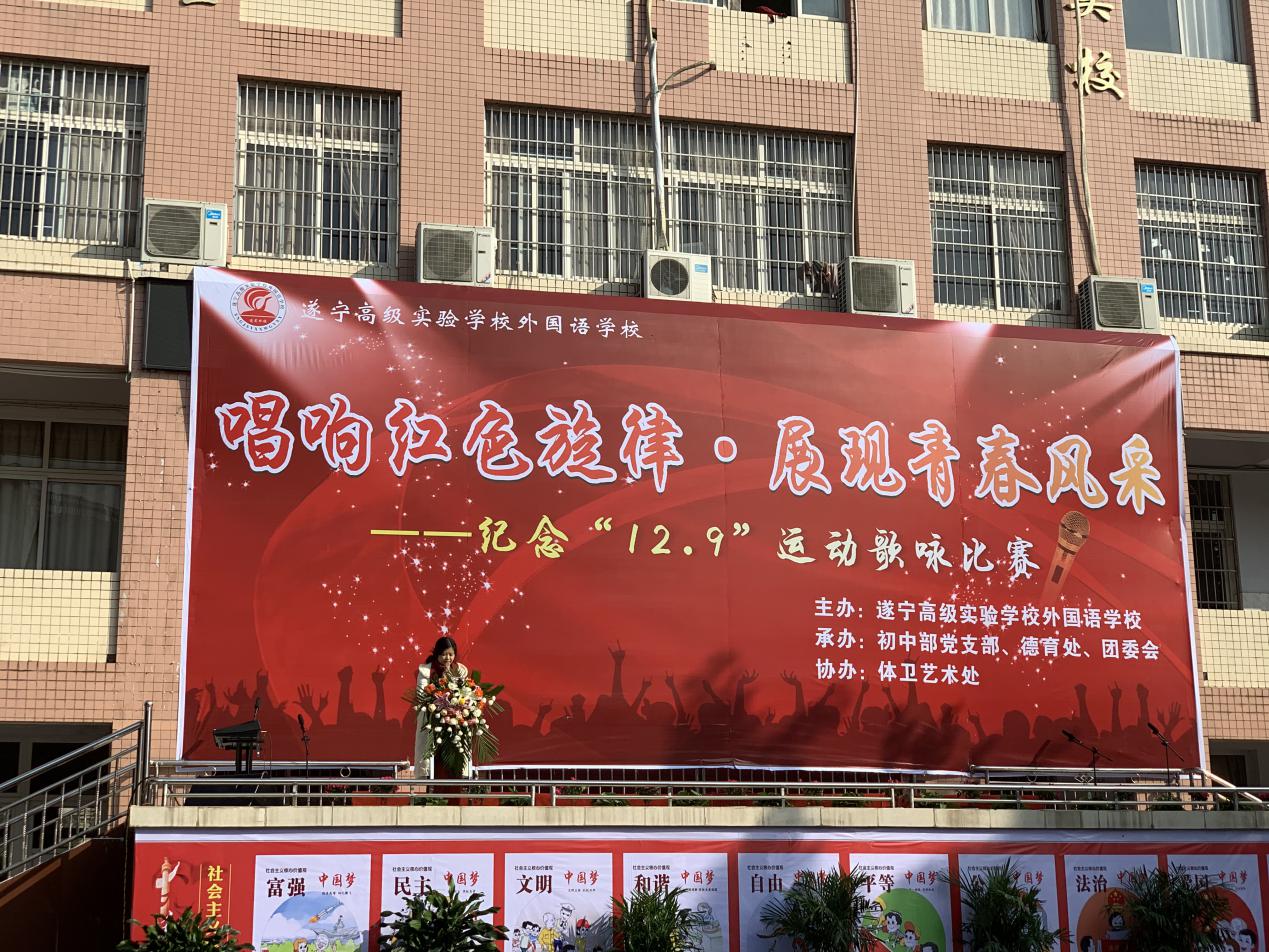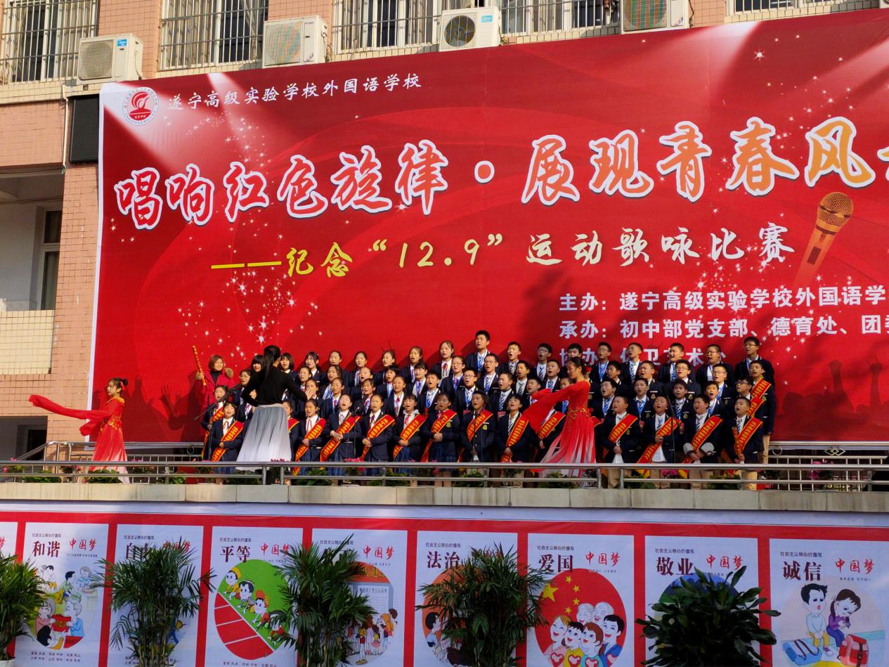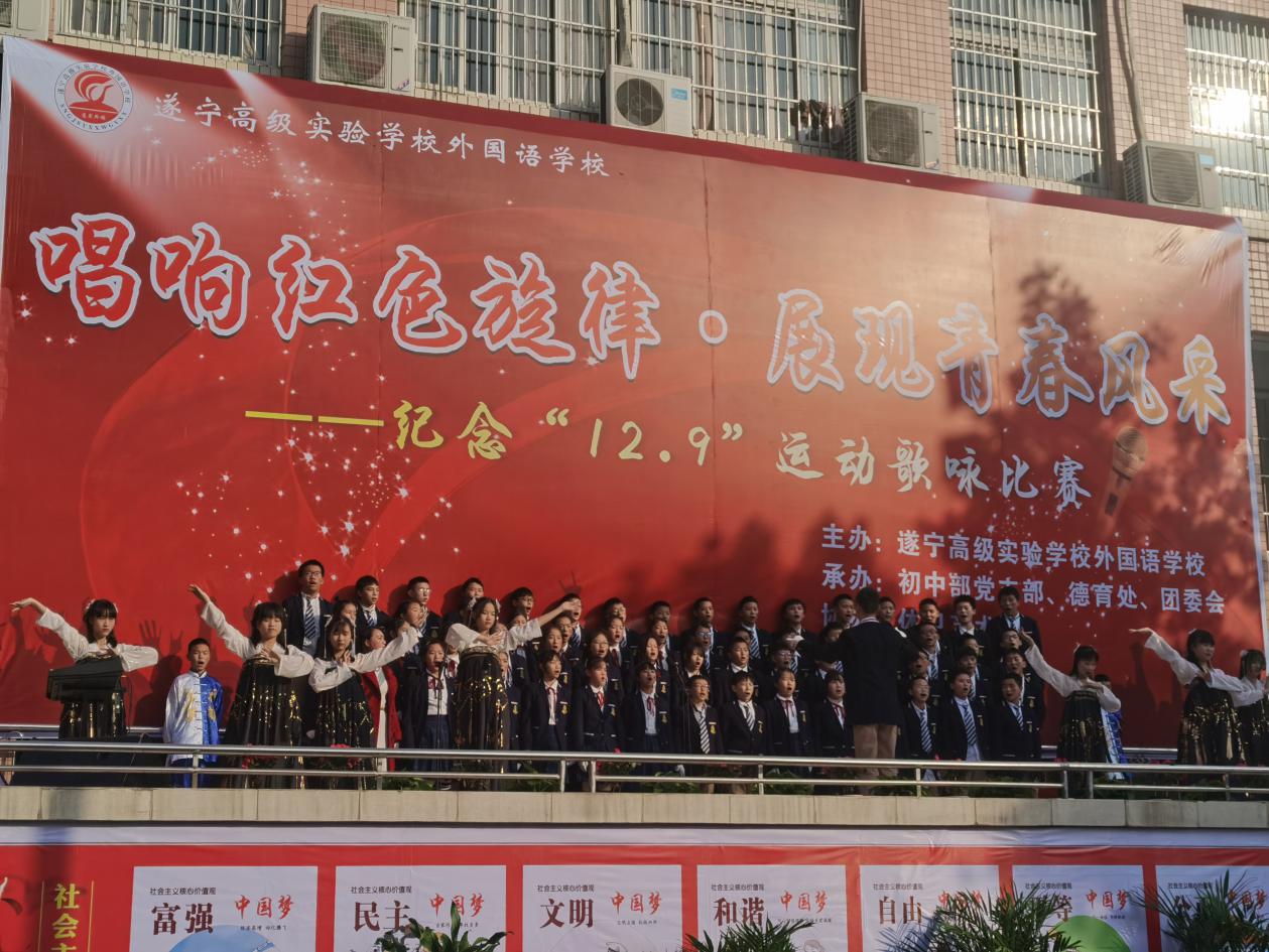 一首红歌,记录一段峥嵘岁月;一首红歌,激励一群青春学子。12月5日下午,在明媚的冬日暖阳照耀下,遂宁高级实验学校外国语学?!俺旌焐?,展现青春风采”暨纪念“12.9”运动歌咏比赛如期举行,初一初二年级32个班两千余名学生参加了活动,学校党委书记校长罗爽,党委副书记外国语学校校长杨洪春、副校长漆斌、张小敏、党委副书记邓政和部分中层领导出席了本次活动。