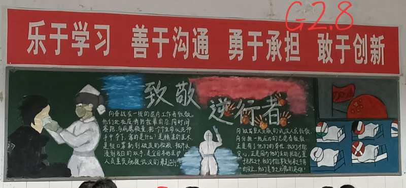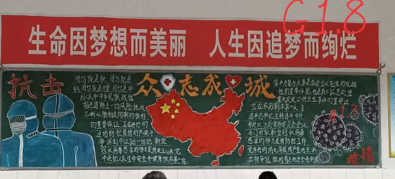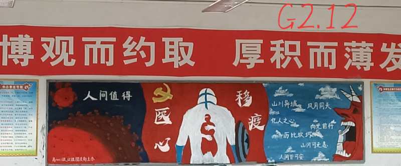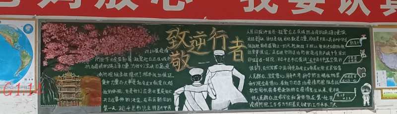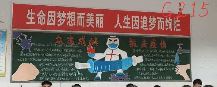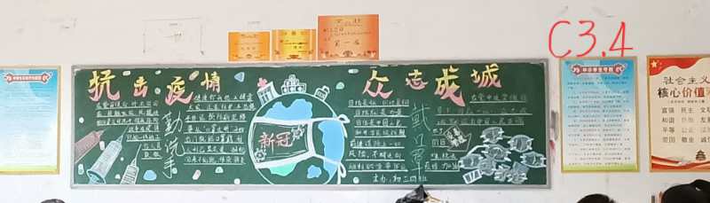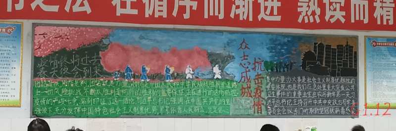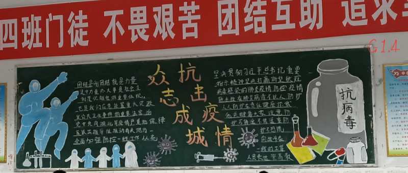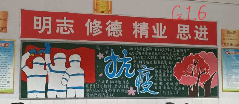 黑板报是学校宣传的阵地,对学生进行教育的媒体。为提高师生疫情防控能力,宣传防疫知识,我??沽撕诎灞ㄉ杓苹疃;疃?,各班教师紧扣防“疫”主题,广泛搜集材料,针对孩子的认知水平,选取趣味性、知识性的内容。再加以绘画,修饰等,一幅幅图文并茂、主题鲜明、形式新颖的板报作品呈现出来。在板报内容选择上,有抗疫英雄人物的介绍,让抗疫成为教材,培养学生从小对英雄的崇敬,树立正确的人生观、价值观;有七步洗手法、正确戴口罩的图解,提高师生的防疫技能,养成健康生活方式;有心理健康教育,舒缓学生居家隔离导致的情绪焦虑,保障学生身心健康。通过活动,抗“疫”板报作品成为校园一道靓丽的风景线,走进教室就有全新的感受。让学生足不出室就能系统的了解学习防疫知识,让黑板报成为战“疫”小阵地。