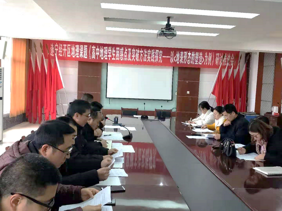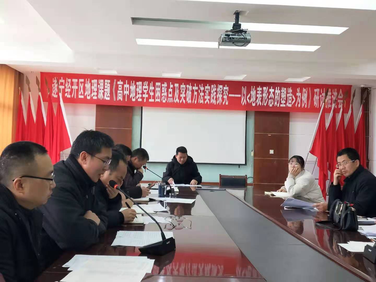 2020年12月24日上午,遂宁高级实验学校遂宁经开区高中地理课题《高中地理学生困惑点及其突破方法实践性探究——以〈地表形态的塑造〉为例》研讨推进会在学校综合楼六楼会议室成功召开。遂宁高级实验学校副校长何涛、教科室主任杨洪、课题组全体成员及其他部分学科课题组人员参加了本次会议。