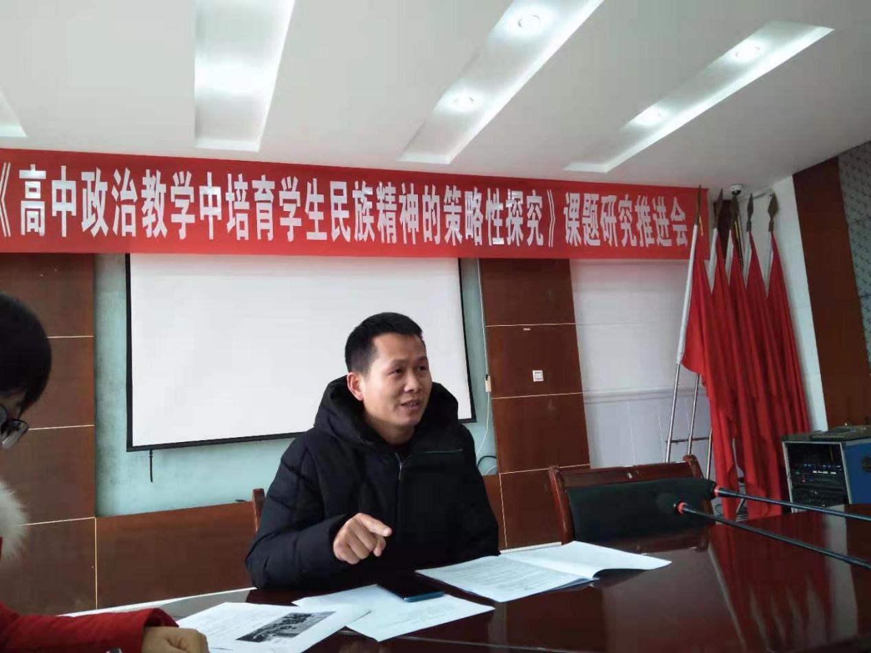 会议由高中政治教研组长、该课题召集人席德金主持。他表达了对与会领导和老师们的热烈欢迎,具体说明了本次会议流程、课题研究意义和基本原则方法。他希望以本次课题研究为起点,最终形成实验学校教学资源下的校本教材,以固定的模式来培育学生的民族精神,从而达到立德树人的目的。